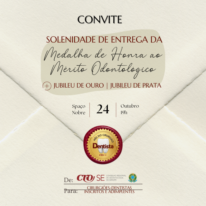 Na próxima sexta-feira, 24 de outubro, o Conselho Regional de Odontologia de Sergipe (CRO-SE) realiza a tradicional Solenidade de Entrega da Medalha de Honra ao Mérito Odontológico, juntamente com a celebração do Jubileu de Ouro e Jubileu de Prata dos profissionais que completaram 50 e 25 anos de Odontologia, respectivamente, e daqueles que tiveram suas inscrições principais transformadas em Remidas.