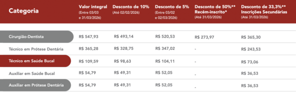 Cirurgiões-dentistas recém-formados que realizarem a primeira inscrição até 60 dias após a colação de grau terão 50% de desconto na anuidade de 2026, válido apenas para pagamento em cota única e com valor proporcional aos meses restantes do ano, considerando o mês da inscrição. Importante mencionar que não se aplica ao profissional que já teve inscrição anterior, mesmo que cancelada.